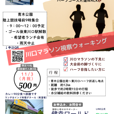 ウォーキングするのにイイ季節になりました。 健康ランニング塾代表の住吉が健康関連事業主のグループ〝健幸ワールド〟とコラボして企画したイベントです。 川口マラソンハーフの片道約12㎞を歩きます。川口マラソンコースの下見に、いつか出場してみたい方に是非ご利用ください?