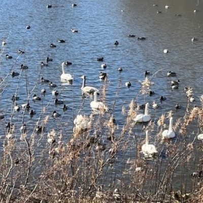 今年は逆回りで白鳥飛来地(七次川調整池)まで何度もトイレ休憩しながらのんびり歩きます。途中から自由歩行(12時30分までゴール出来る方・約4㎞)。今年も沢山の白鳥に会えます。